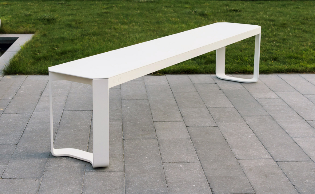 Leurs angles à 45°, prolongés dans les coins du plateau, assurent une continuité visuelle harmonieuse et adoucissent les contours. Nos bancs reprennent ce même langage graphique, avec une assise large et stable qui invite naturellement à la convivialité. Côté plateaux, le verre trempé mat séduit par son élégance satinée et son toucher soyeux, tandis que l’aluminium, fixé de manière invisible, renforce l’esthétique monobloc de l’ensemble.